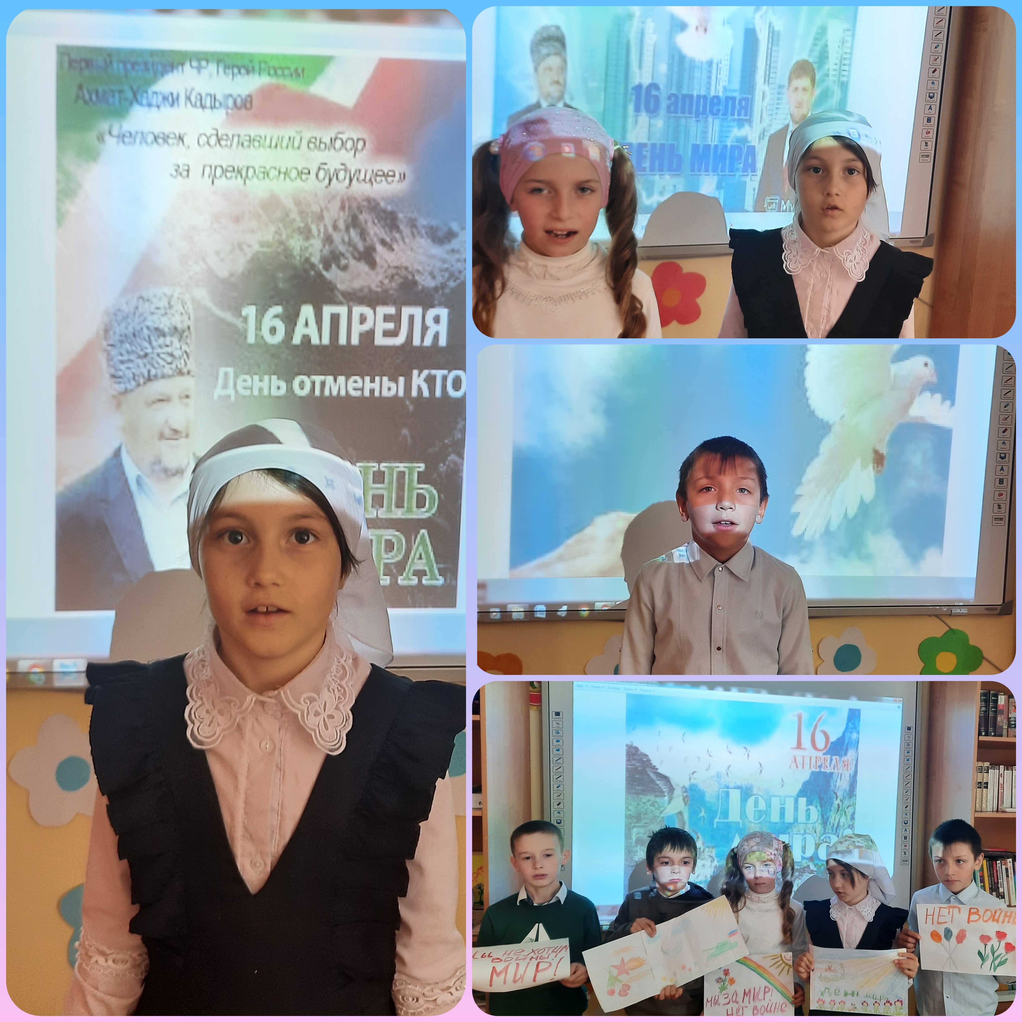Ко Дню отмены КТО, в СОШ с.Шарой проведены классные часы. Цель: вспомнить страницы истории ЧР, подчеркнуть роль Главы Чеченской Республики в восстановлении разрушенных городов и сёл, воспитывать патриотизм. В ходе классного часа проведена беседа о подвиге Первого Президента Чеченской Республики Ахмата-Хаджи Кадырова. Рассказано о режиме КТО в ЧР. Дети прочитали стихи о войне, героях и мире. Проведен конкурс рисунков ко Дню мира.