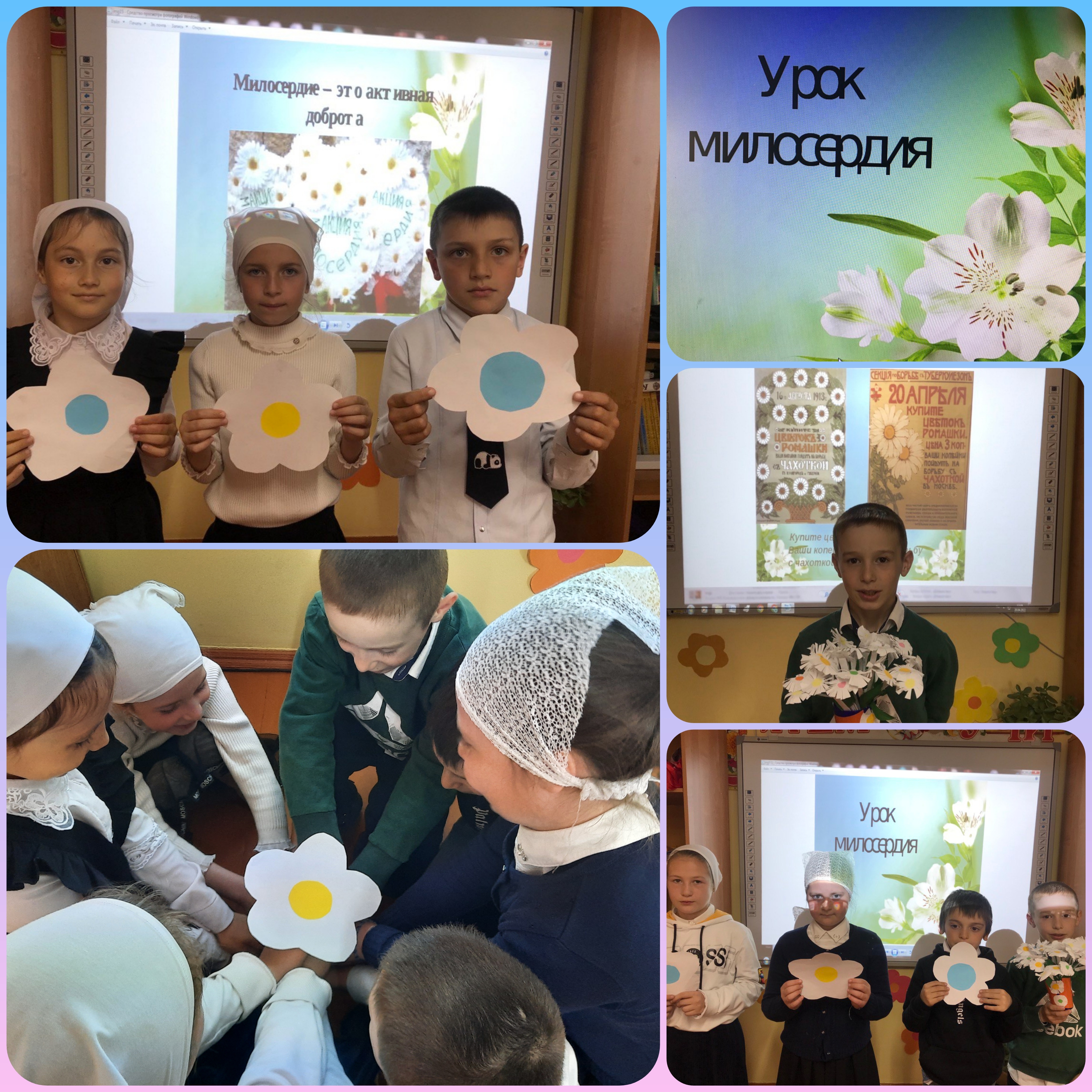В ходе урока учащимся рассказали притчу о милосердии. Также, учащиеся ознакомились с историей Белого цветка в России. Дети прочитали стихи о доброте и милосердии.