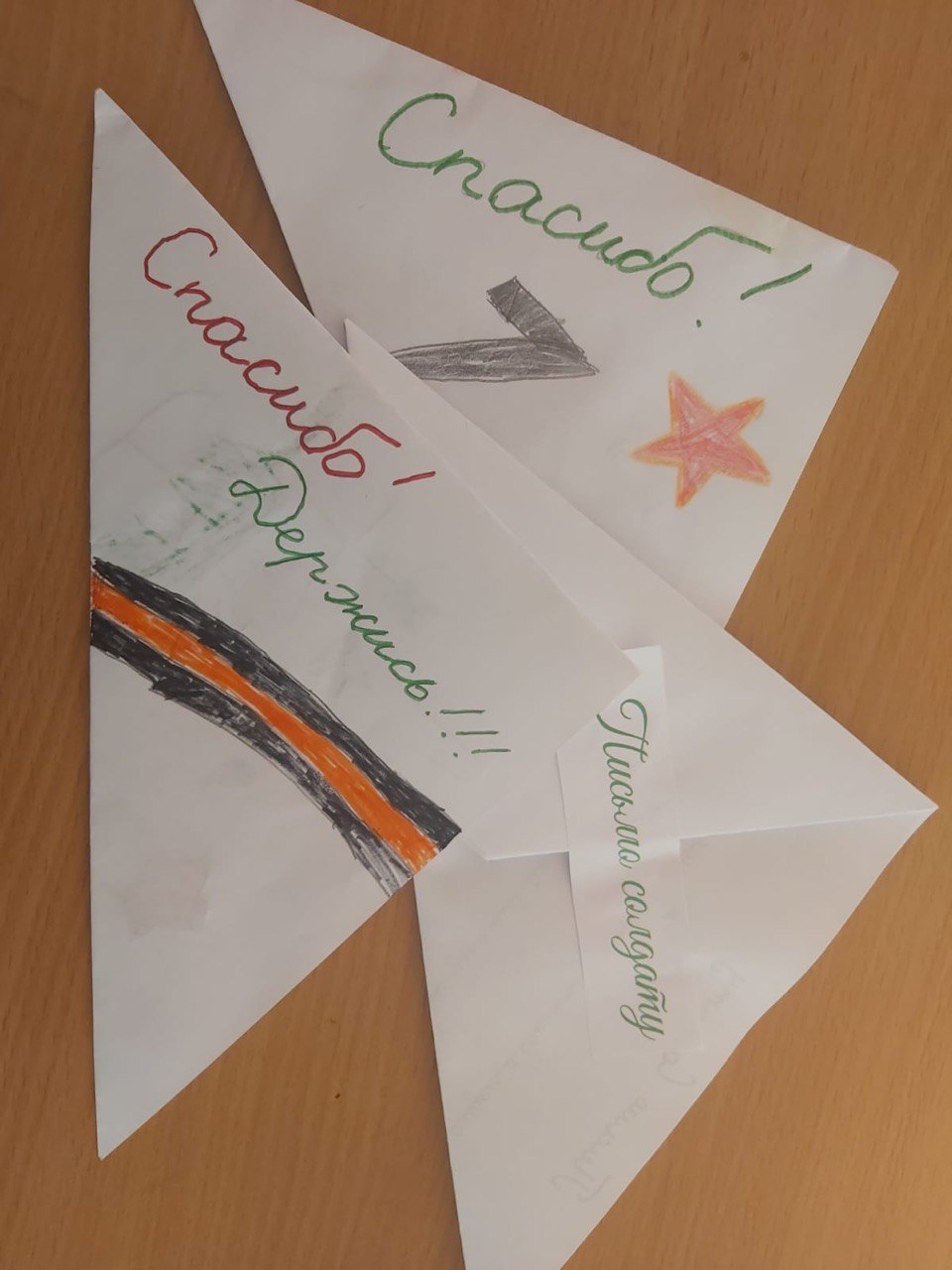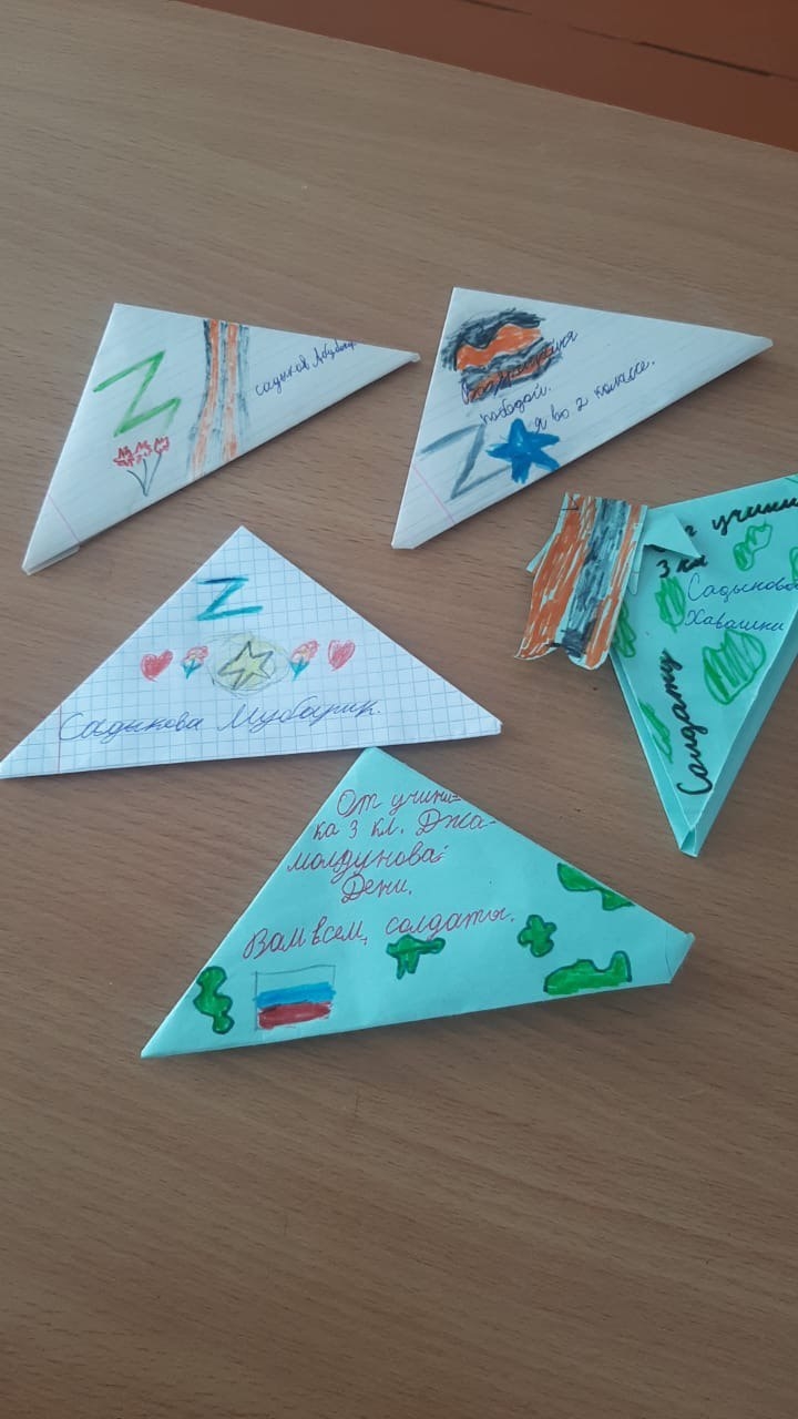 Шаройские школьники присоединились к Всероссийской акции «Письмо солдату» и написали письма поддержки российским воинам, которые сегодня выполняют свой долг, принимая участие в специальной военной операции на Украине. Написать письмо солдату для многих ребят оказалось очень важным и ответственным делом. Тёплые, искренние, добрые слова поддержки отправились туда, где сейчас напряжённо, ответственно, опасно. Ребята сложили написанные письма в треугольники, как это делали солдаты во время Великой Отечественной войны. В детских посланиях — слова благодарности, трогательные стихи и рисунки, пожелания здоровья и скорейшего возвращения домой всем тем, кто в данный момент выполняет боевые задачи.
