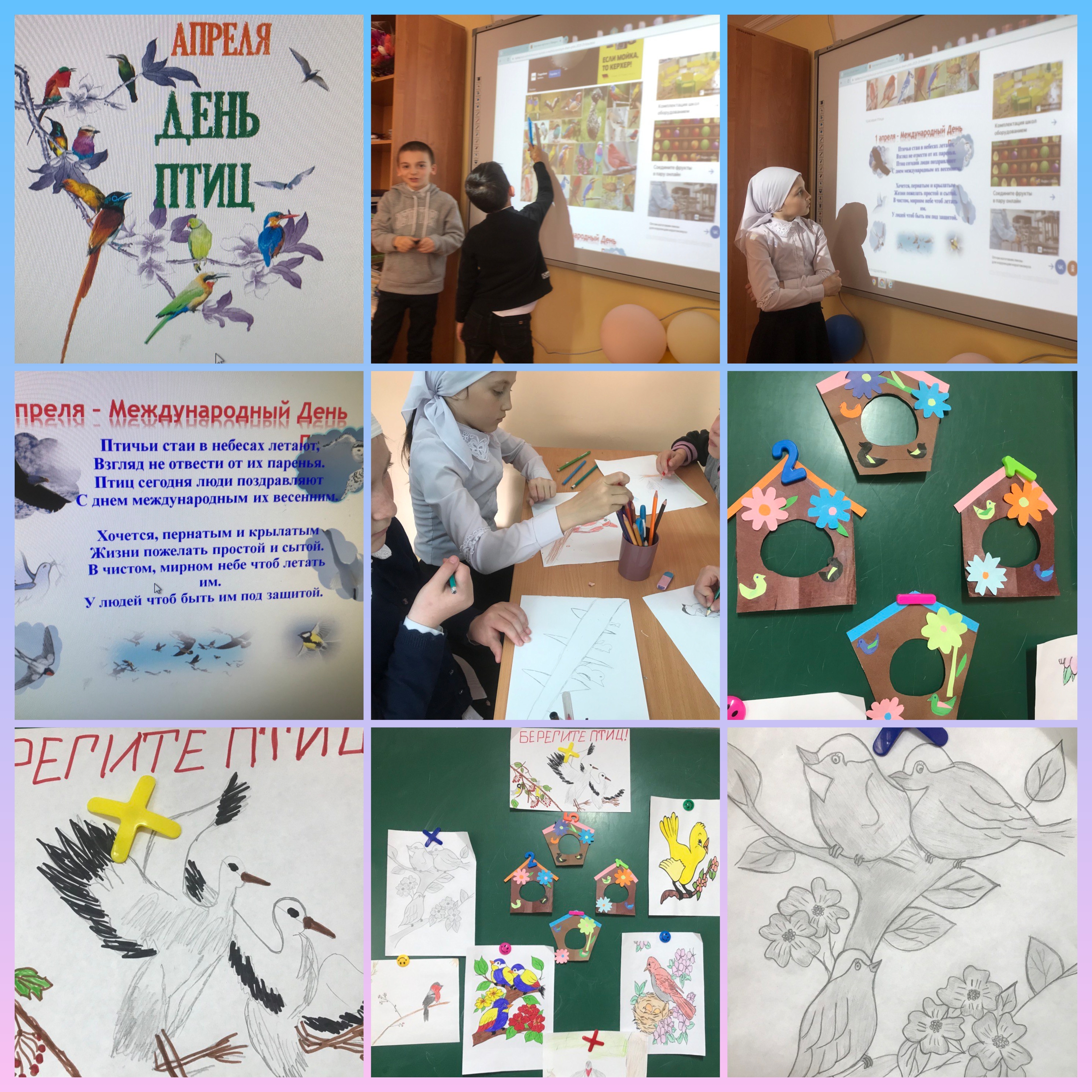 К этому дню коассные руководители и ребята тщательно готовились: изучали птиц нашей местности, читали стихи, проводили беседы о птицах, слушали птичьи голоса, делали поделки и рисунки.Ребята отгадывпли загадки, приняли активное участие в викторине: "Что ты знаешь о птицах?"По картине ребята кгадываои птиц, давали им описание, рассказывали о них информацию. Задача была не из легких, но ррбята с ней справились.